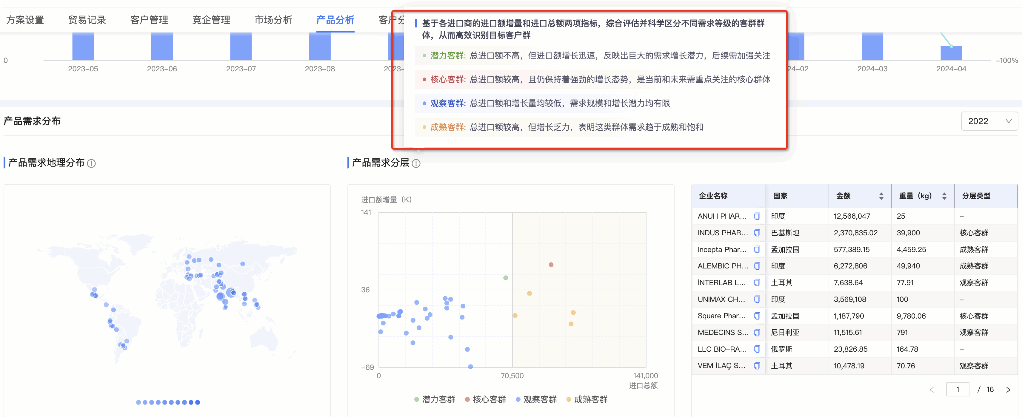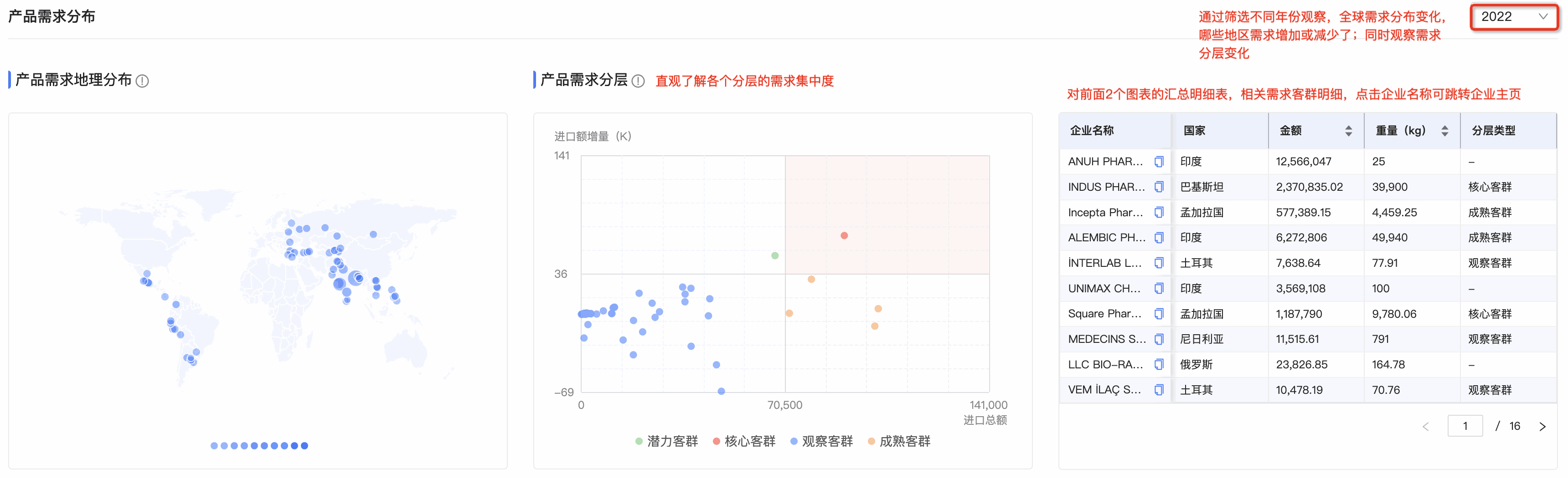 ● 产品需求分层图:K8凯发(中国)数据通将需求客群按照进口额增量和总额进行分层,划分为潜力、观察、成熟和核心四个层级。分层有助于用户快速锁定目标客户群体。标题旁附需求分层的解读,能让用户更直观、快速理解每个层级的特征,能够更快速的识别目标客群。